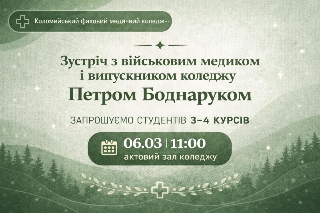 6 березня 2026р. за ініціативою органів студентського самоврядування в Коломийському медичному фаховому коледжі ім. І.Франка відбулася зустріч студентів з військовим медиком, випускником коледжу Петром Боднаруком. Зустріч пройшла в теплій і дружній атмосфері. Студенти одержали відповіді на актуальні питання сьогодення.