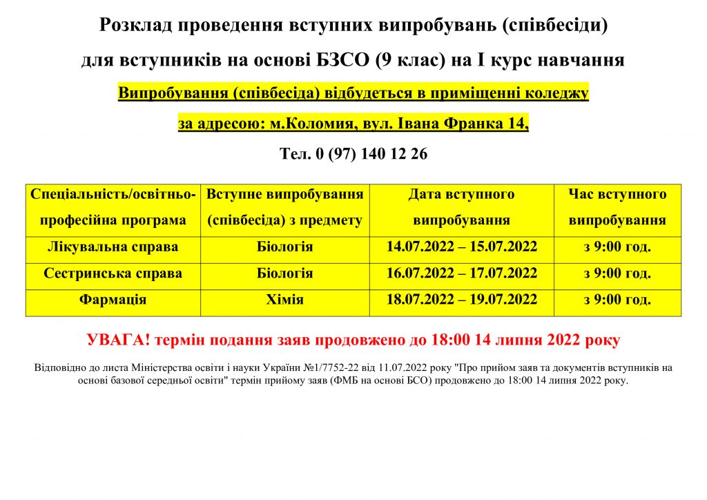 Розклад проведення вступних випробувань (співбесіди) для вступників на основі БЗСО (9 клас) на І курс навчання