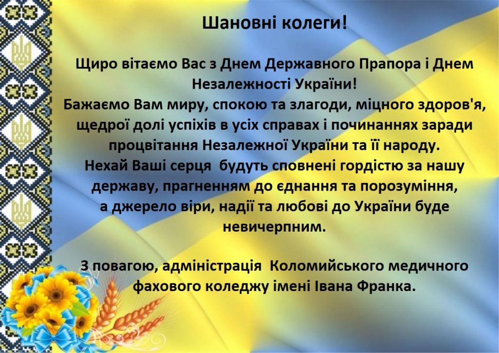 Щиро вітаємо Вас з Днем Державного Прапора і Днем Незалежності України! Бажаємо Вам миру, спокою та злагоди, міцного здоров’я, щедрої долі успіхів в усіх справах і починаннях заради процвітання Незалежної України та її народу. Нехай Ваші серця будуть сповнені гордістю за нашу державу, прагненням до єднання та порозуміння, а джерело віри, надії та любові до України буде невичерпним.